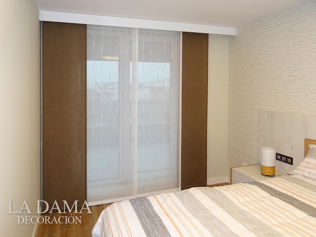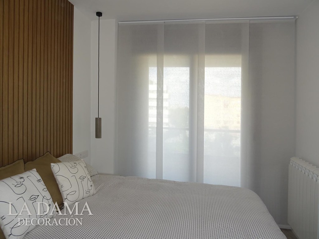 Los paneles japoneses no son tan populares en los dormitorios como lo son en los salones al ser ventanas más pequeñas. En los dormitorios clásicos o dormitorios de matrimonio lo que mejor queda son los paneles centrales de tela bordados con laterales lisos, y para un dormitorio más juvenil el panel japonés es algo que rara vez se instale, la mejor opción es optar por una cortina, un estor o una enrollable.